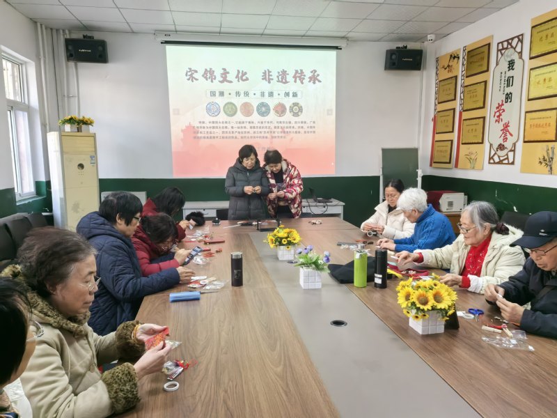 活动现场洋溢着欢乐祥和的节日氛围。桌上铺满了彩绳、丝线、珠子等各色材料。在工作人员的引导和协助下,老同志们全情投入,兴致盎然地学习非遗手工技艺。大家或仔细聆听讲解,或相互交流探讨,巧手翻飞间,一片片宋锦巧妙组合。经过精心制作,一件件精致美观、寓意吉祥的手工挂件陆续诞生,凝聚着老同志们的巧思与祝福。